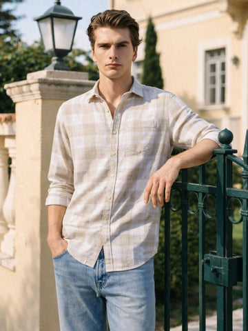 Men's Cream Slim Fit Checkered Casual Shirt