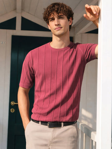 Men's Rust Oversized Fit Textured Flat Knit Crew Neck T-Shirt