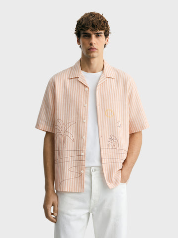 Men's Orange Oversized Fit Embroidered Resort Wear Shirt
